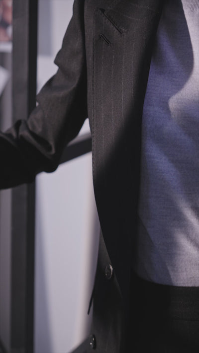 Un ansamblu made to measure clasic, reinterpretat cu rafinament. Sacoul, realizat din tesatura premium Loro Piana din lana virgina, se distinge prin reverul ascutit, inchiderea la doua randuri de nasturi si talia cambrata care contureaza silueta.