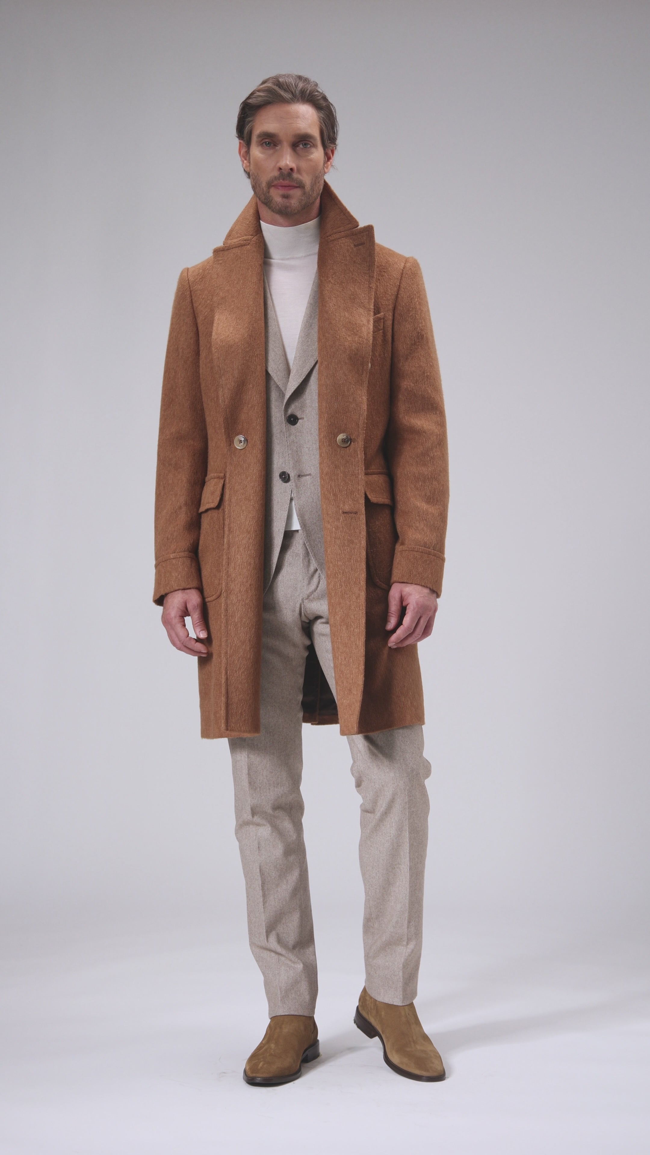 The Viggo coat made of camel hair fabric and natural silk outlines a silhouette with balanced proportions and carefully studied details.