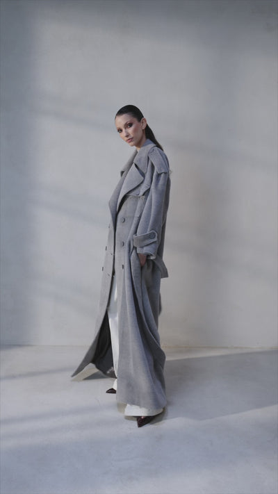 Acest palton bespoke de dama intr-un gri sofisticat este expresia pura a noilor tendinte prin jocul echilibrat intre volum, structura si proportii ample. Construit la doua randuri de nasturi si avand cordon in talie, modelul imbratiseaza o croiala oversize, gandita in miscare, cu focus pe confort fara a renunta la eleganta.