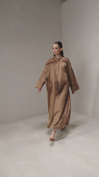 Tonurile blande de camel devin un gest de eleganta subtila in pardesiul tip capa pentru Ea, realizat in regim Bespoke din tesatura pretioasa de casmir si matase Fratelli Tallia di Delfino. Croiala cu gluga si maneci largi este fluida, cu volum exagerat in partea superioara, dar se echilibreaza prin linia alungita a pardesiului.