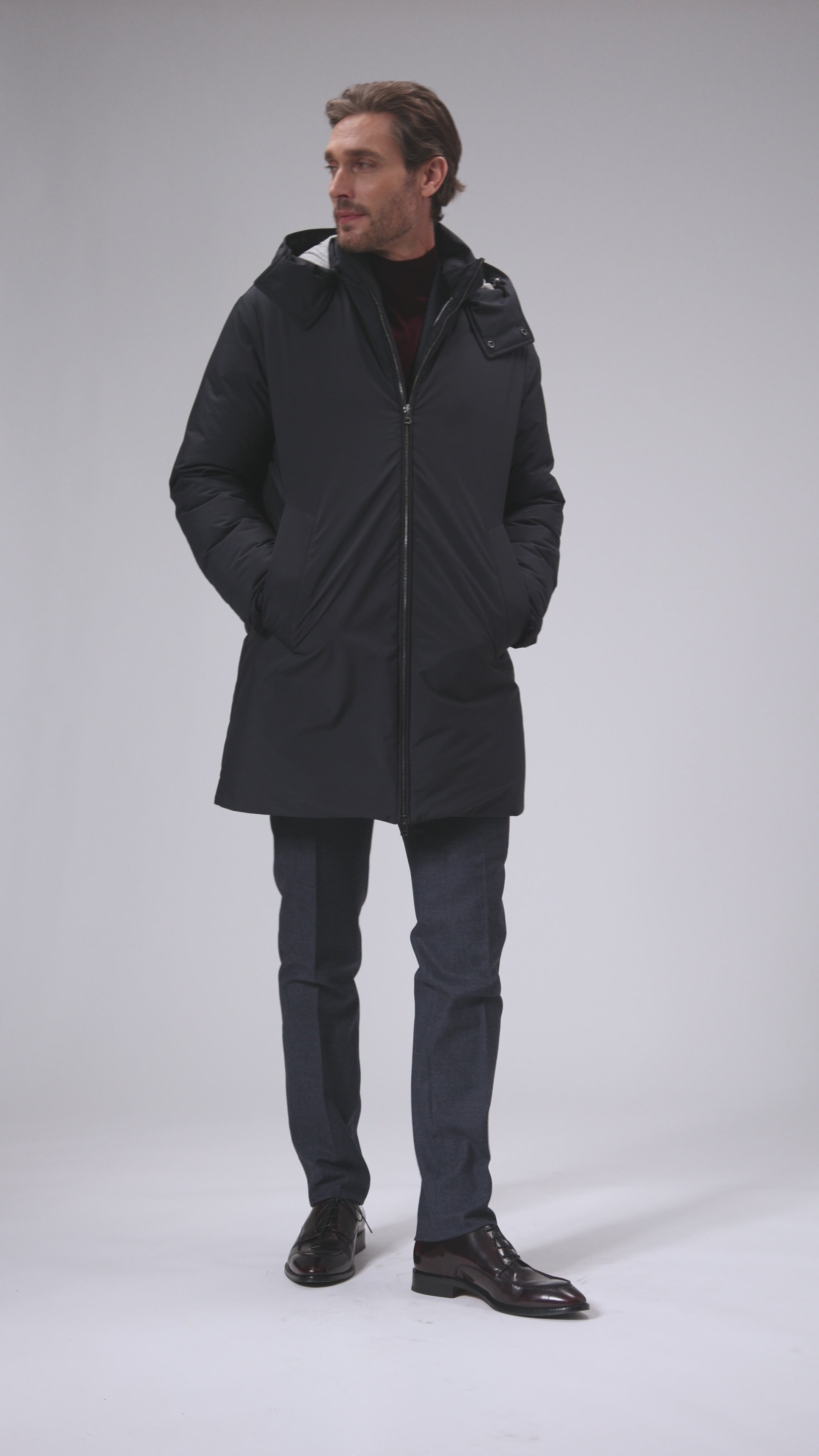 Tailoring meets functionality in a limited edition collection that combines 100% natural down with innovative materials such as multilayer membrane with techno properties: impermeability, water resistance, breathability. The certified down composition of Italian origin, with a density of 750 cuin, ensures thermal comfort up to temperatures of -20 degrees.