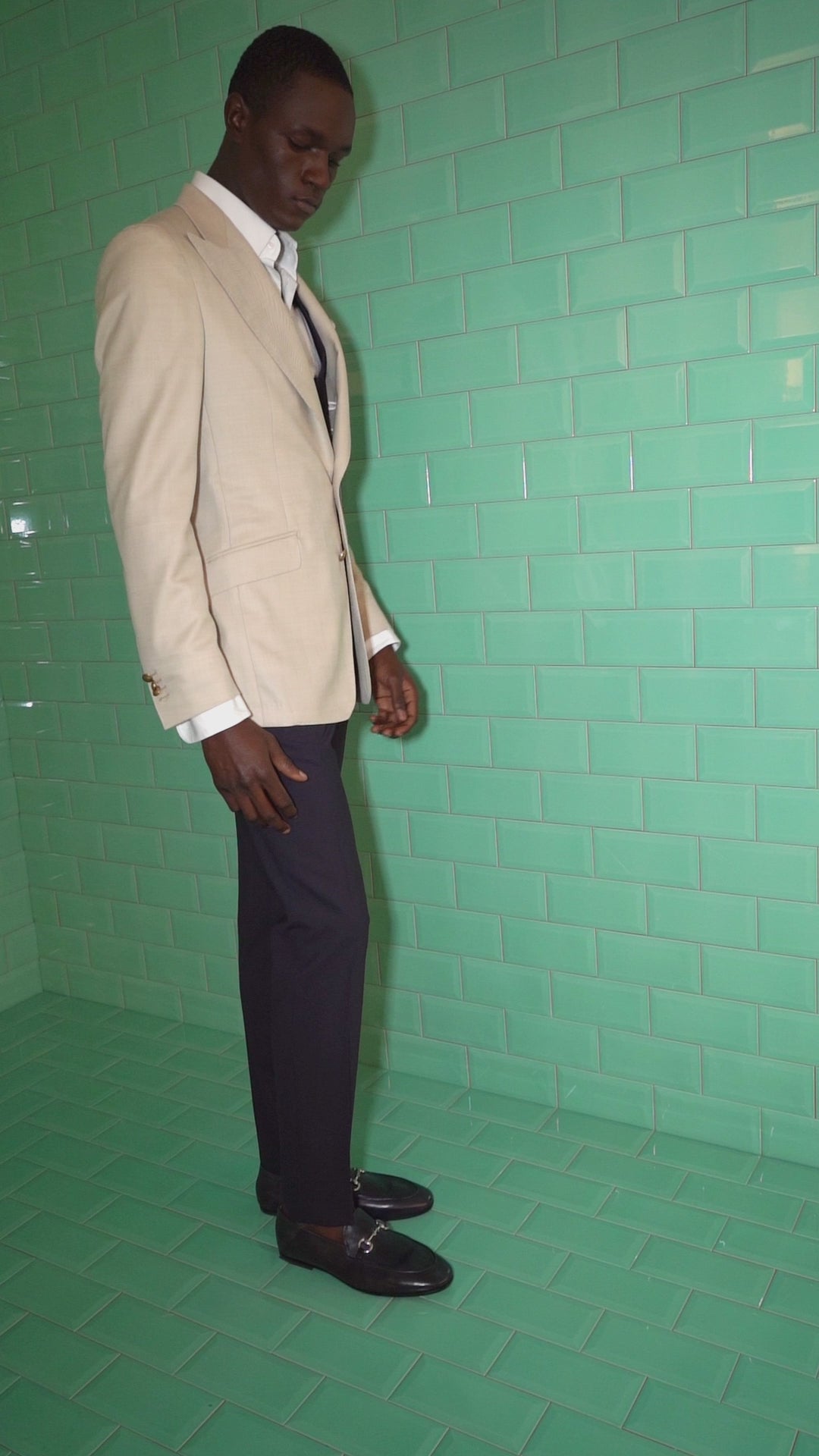 - 12 cm pointed lapel, slightly curved, with hand-stitched buttonhole, felt collar, chest pocket and two patch pockets, functional buttonholes, amph stitching, gold metal buttons, two-button closure, two slits at the back, inside pockets , semi-padded