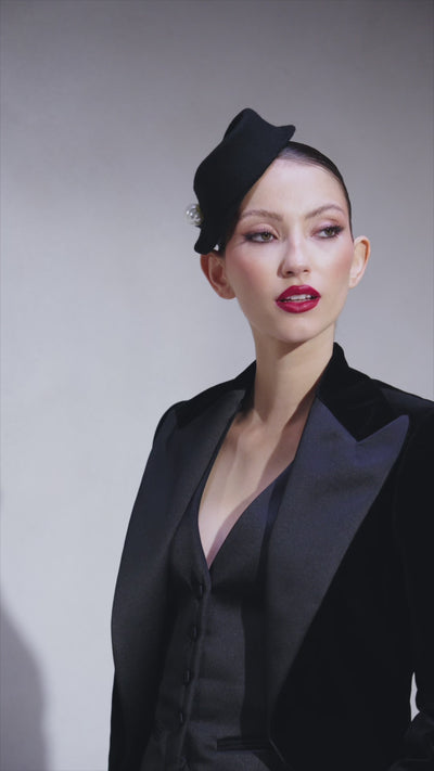 Costumul de ceremonie din trei piese, realizat made to measure din catifea de bumbac, propune o interpretare sofisticata si sculpturala a elegantei feminine. Sacoul se evidentiaza prin detaliile imbracate in matase: reverul ascutit, refiletii buzunarelor si nasturii, conturand un contrast tactil al texturilor. Vesta, la randul ei, din matase neagra, completeaza armonios alegerea unui pantalon din catifea cu vipusca din matase. Modelul wide cu betelie inchisa lateral, confera fluiditate si o structura moderna ansamblului.