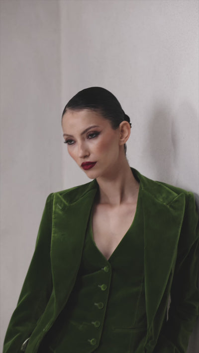 Acest costum din trei piese de catifea verde semnata Carnet, 100% bumbac, reinterpreteaza tailoringul feminin intr-o cheie moderna si sofisticata. Sacoul, cu rever ascutit, prezinta buzunare cu clapeta inclinate si detalii cu un aer sartorial impresionant. Nasturii imbracati in aceeasi catifea completeaza look-ul cu o eleganta impecabila.