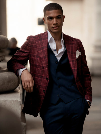 Supletea tesaturii Loro Piana exceleaza prin combinatia de lana virgina, matase si in. Carourile asumate 100% fac din imprimeul ordonat un adevarat statement accentuat de alaturarea cromatica a nuantelor bordeaux si corai.
