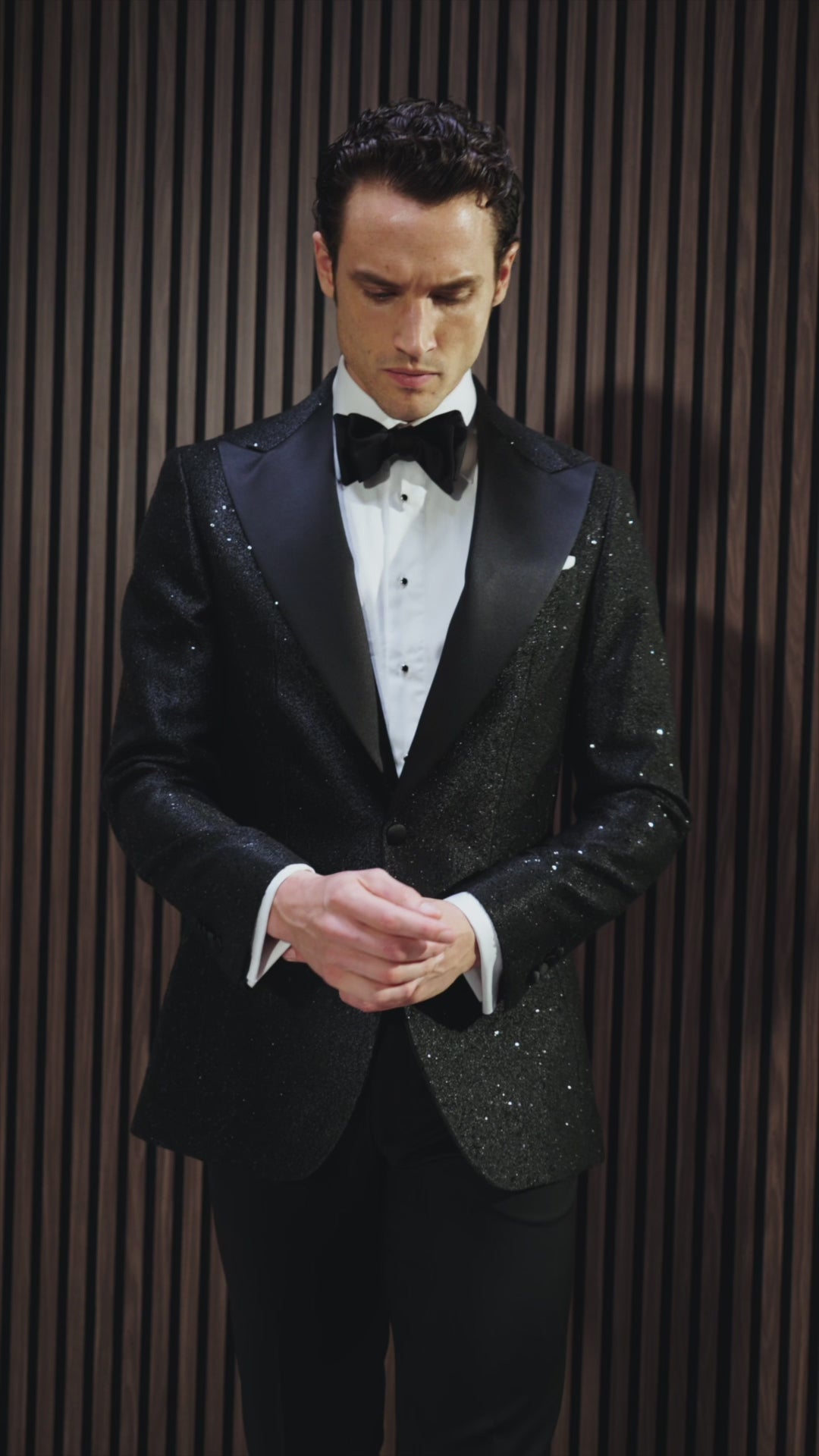Un exercitiu de eleganta nocturna. Acest smoking Made to Measure imbina stralucirea controlata a paietelor negre cu rigoarea croielii clasice.